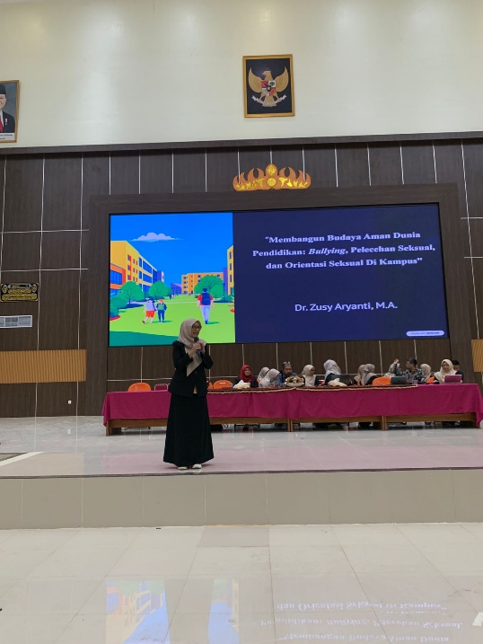 Kegiatan selanjutnya yaitu pengisian materi dan disukusi mengenai pentingnya membangun budaya aman dari bullying dan pelecehan seksual. Melalui materi ini, mahasiswa diberi pemahaman bahwa kampus harus menjadi ruang aman dan nyaman bagi semua pihak. Upaya pencegahan, penanganan, serta mekanisme pelaporan turut disosialisasikan agar mahasiswa berani bersuara dan saling menjaga satu sama lain.