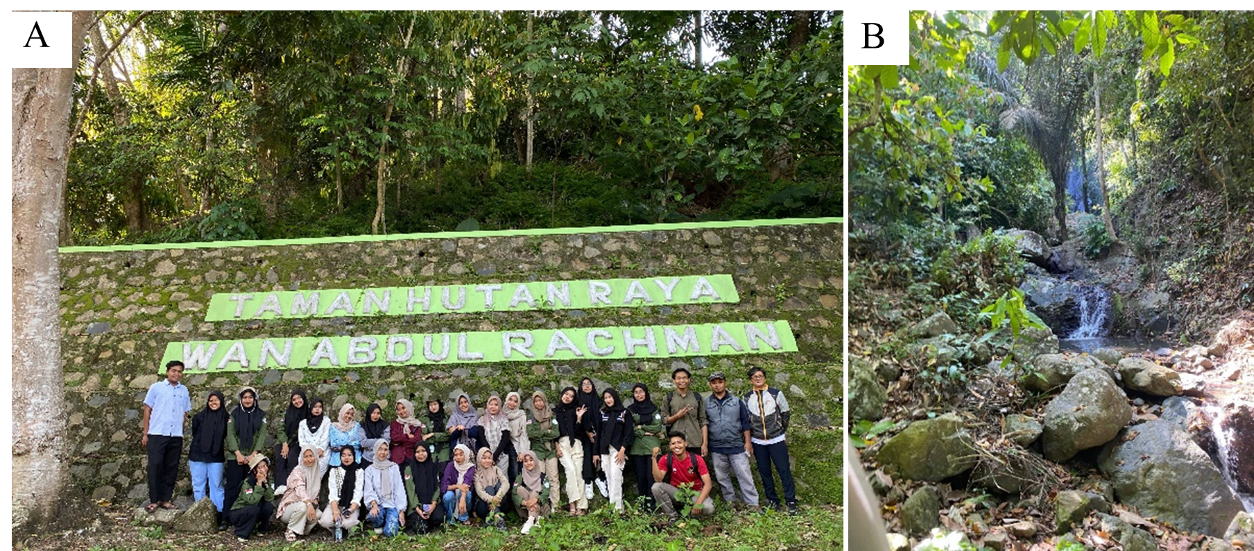 Gambar 4. Mahasiswa, Asisten Lapangan, dan pengelola TAHURA berfoto bersama di Youth Camp – Bumi Perkemahan TAHURA (A); Air Terjun sebelah kiri (B).